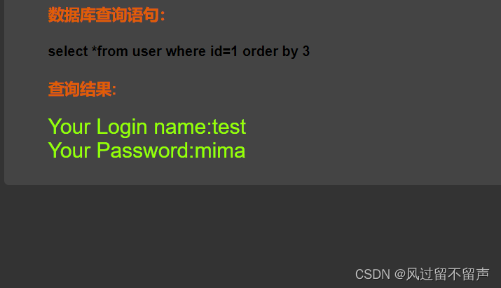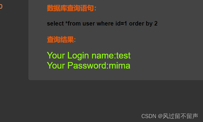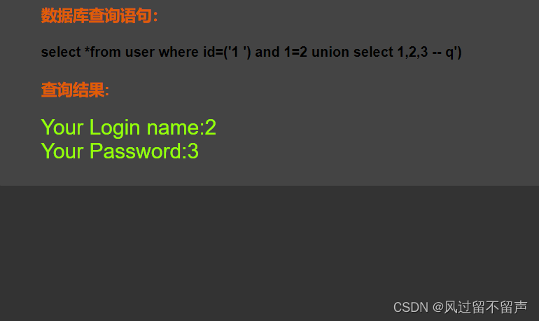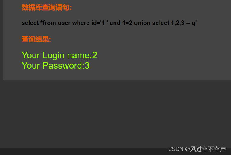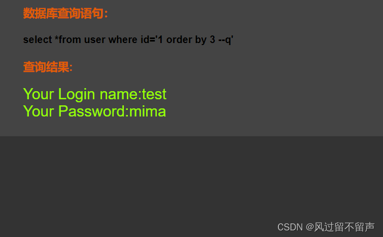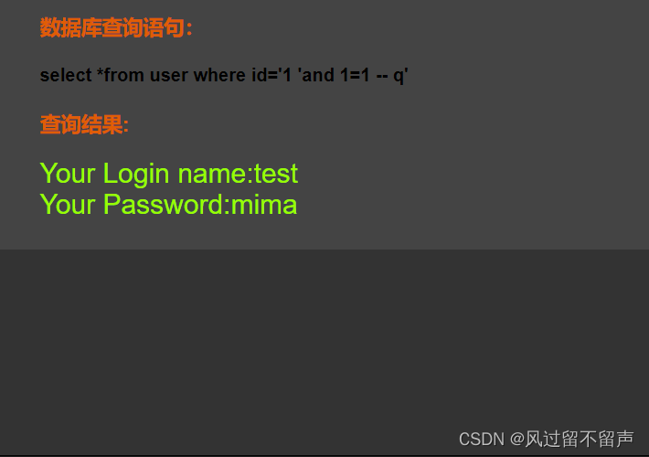 输入’ and 1=1 – q select *from user where id=‘1 ’ and 1=1 – q’