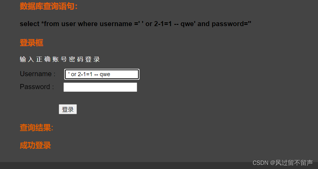 select *from user where username =‘’ or 2-1=1 – qwe’ and password=‘’