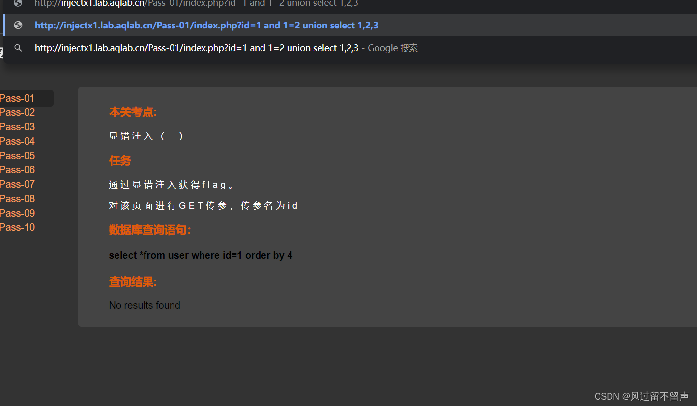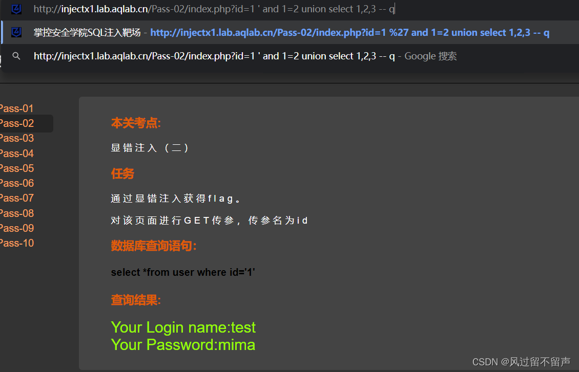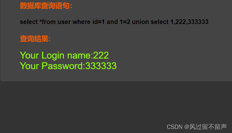 输入and 1=2: select * from user where id=‘1 and 1=2’