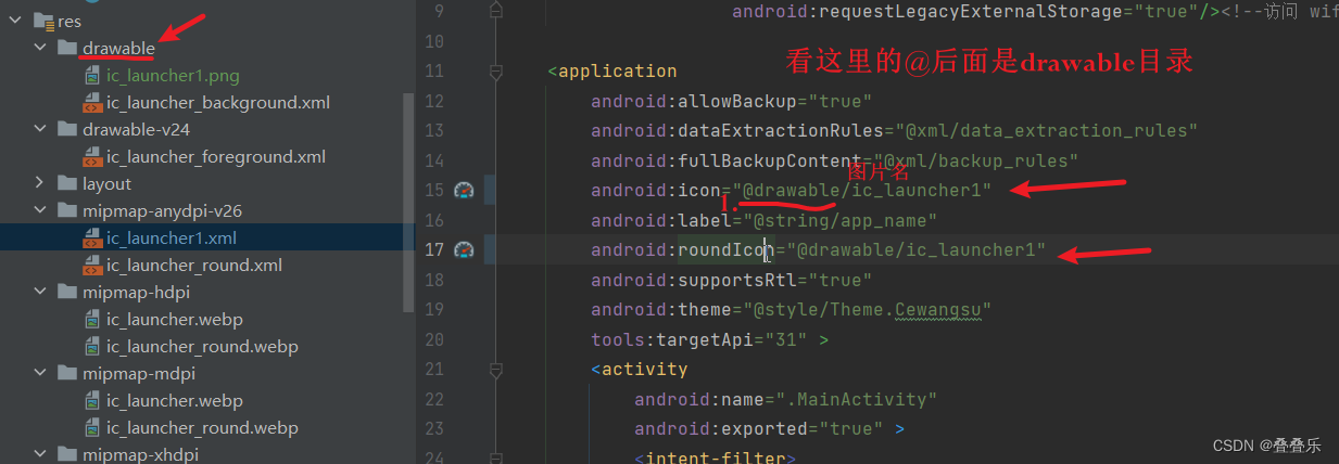- 然后打开AndroidManifest.xml 文件 看icon 和 roundIcon
