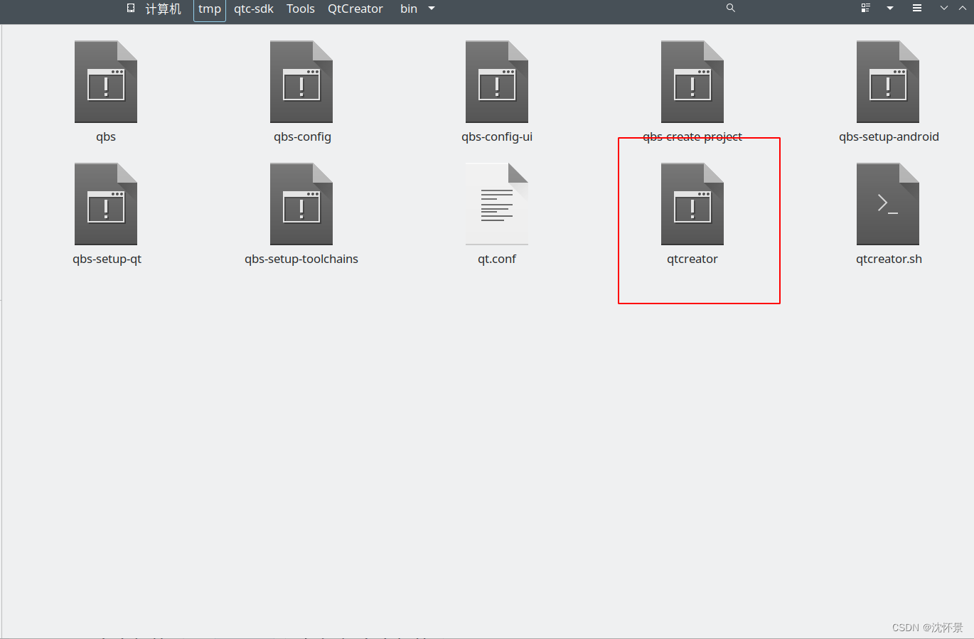 通过上述方法完成QtCreator的安装后,系统可能不会自己生成启动图标(我的就没有),所以需要在安装路径里找。以我个人的为例,在图中所示位置找到启动图标。