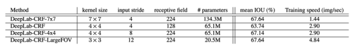 在DeepLab v1的论文中共提出了4个不同的网络结构,它们的的参数,准确率以及速度如表1。其中卷积的操作是指添加到网络中最后一层(fc6)的空洞卷积的超参。 从表中我们可以看出,DeepLab-CRF-LargeFOV(Field of View)无论是速度还是精度都表现比较优秀,因此也是被业内广泛采用的网络结构。