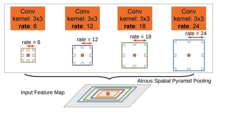 对比DeepLab v1,DeepLab v2依旧保持了图1的流程,即以空洞卷积和CRF为核心。DeepLab v2的改进点之一是将VGG-16替换成了残差网络。另外一个核心点便是引入了空洞空间金字塔池化(Atrous Spatial Pyramid Pooling,ASPP)。