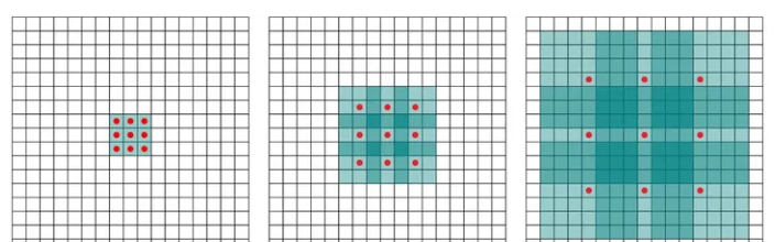 那么如何在不使用池化的情况下扩大感受野呢?空洞卷积应运而生。顾名思义,空洞卷积就是往卷积操作中加入“空洞”(值为0的点)来增加感受野。空洞卷积引入了扩张率(dilated ration)这个超参来制定空洞卷积上两个有效值之间的距离:扩张率为 r的空洞卷积,两个有效值之间有 r−1 个空洞,如图2所示。其中红色的点为有效值,绿色的放个为空洞。如图2.(a)所示,$r=1$是空洞卷积变为普通卷积。