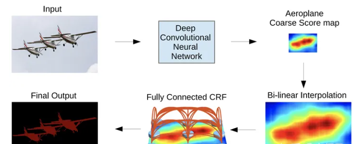 DeepLab v1有两个核心点,即:空洞卷积和CRF。它首先将VGG的普通卷积替换为空洞卷积得到分隔图,在通过CRF将得到的分割图进行后处理优化,如图1所示。