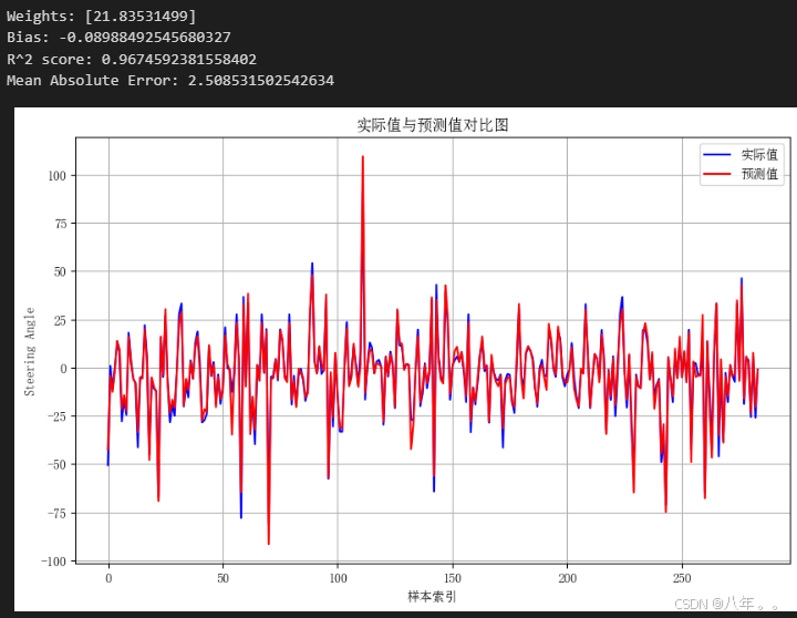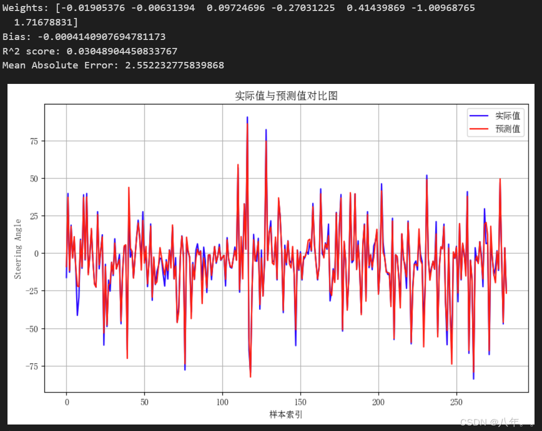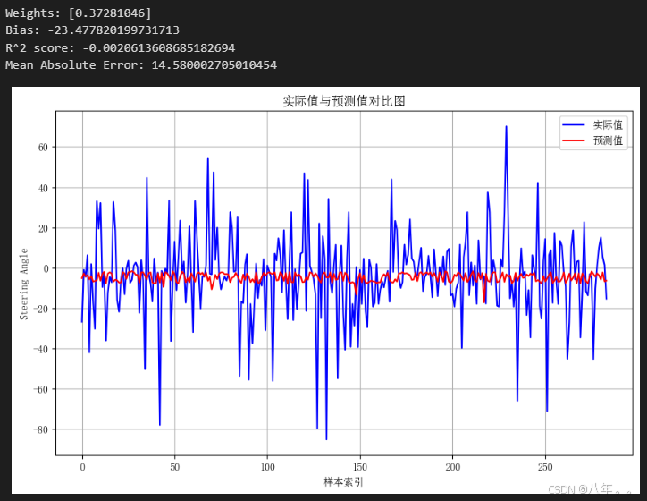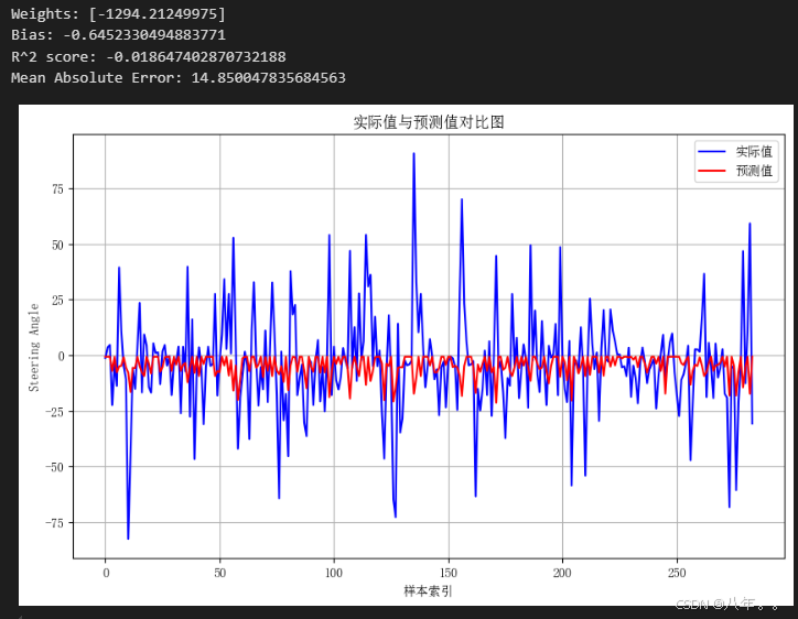 6、只采用速度作为特征时,输出结果:(可以看到效果很差,因为速度对方向盘转角有影响,但影响不大,而且应该也是非线性的,另一个原因可能是因为样本量太少)