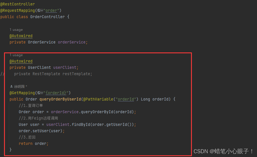 修改order-service的OrderController类中的queryOrderById方法,使用Feign客户端代替RestTemplate: