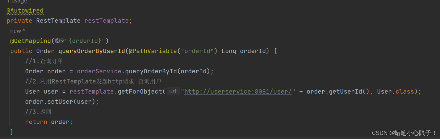 在这篇博客中我们学会了如何使用RestTemplate实现微服务之间的远程调用,我们来看一下利用RestTemplate发起远程调用的代码: