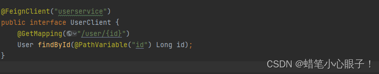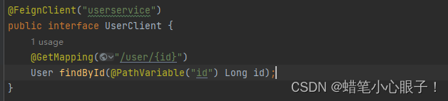 这个客户端是基于SpringMVC的注解来声明远程调用的信息,比如: