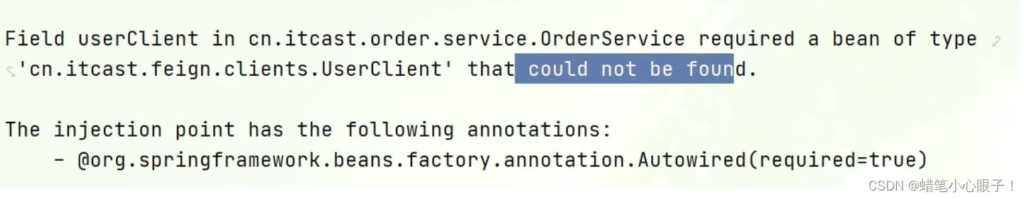 这是因为UserController现在在cn.itcast.feign.clients包下,而order-service的@EnableFeignClient注解是在cn.itcast.order包下,不在同一个包,无法扫描到UserClient.