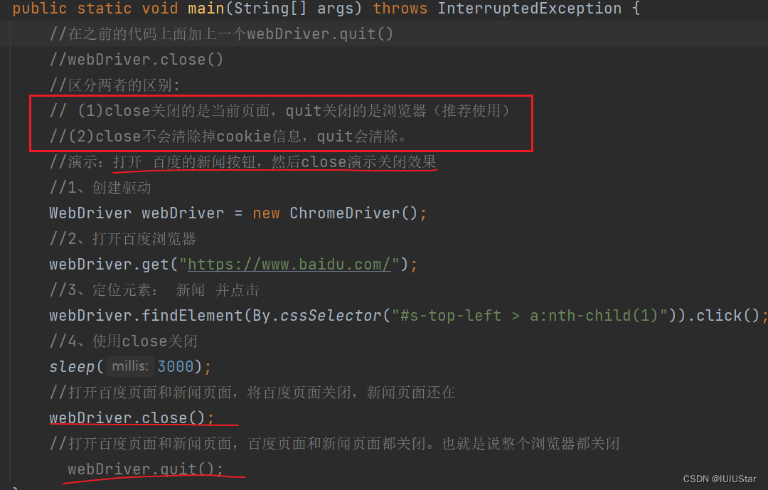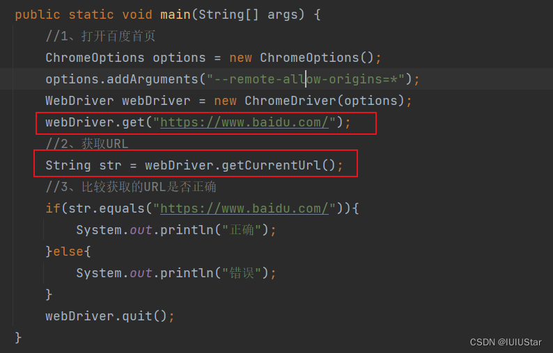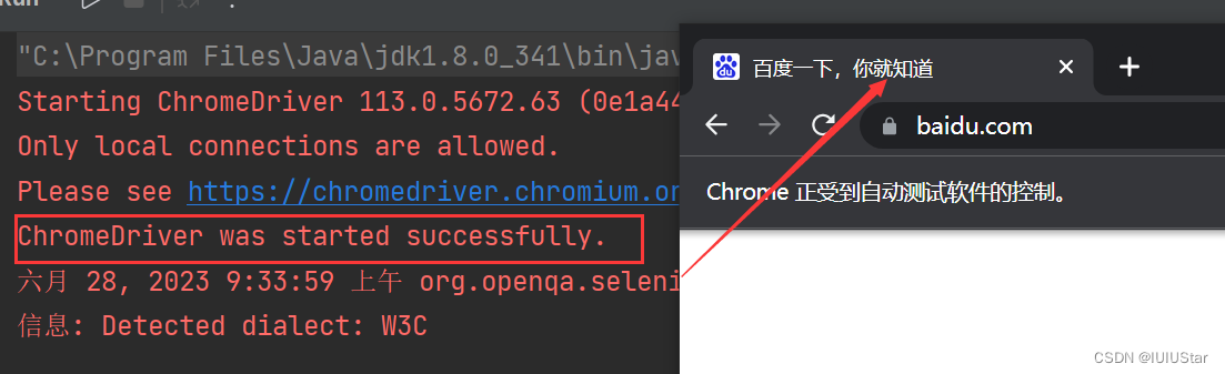public static void main(String[] args) throws InterruptedException { ChromeOptions options = new ChromeOptions(); options.addArguments("--remote-allow-origins=*"); WebDriver webDriver = new ChromeDriver(options); webDriver.get("https://www.baidu.com"); }成功打开百度页面即安装成功。