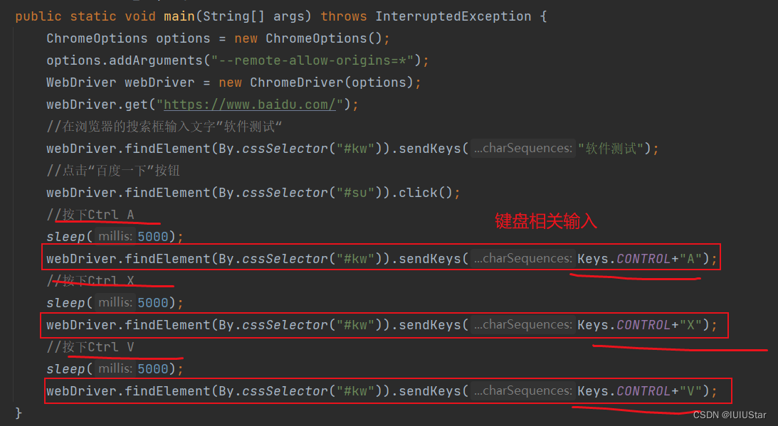 先在输入框输入“软件测试”,然后Ctrl A全选,Ctrl X剪切,最后Ctrl V粘贴。Keys.CONTROL+"A"