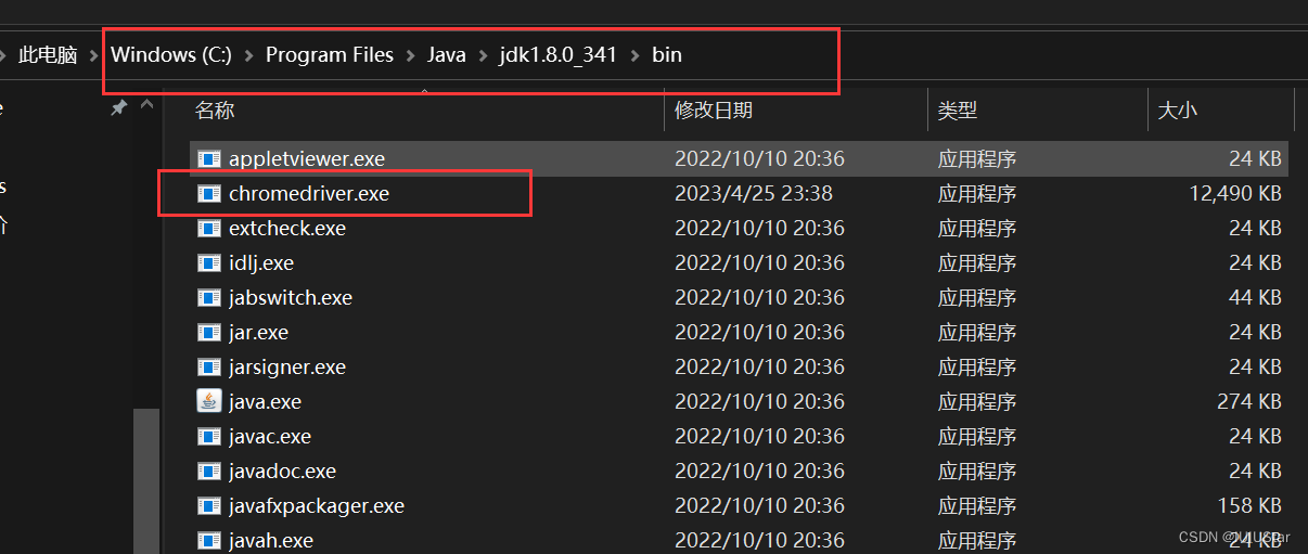 (3)配置环境变量:将下载的chromedriver.exe放在Java的安装路径下(java下的bin目录里):