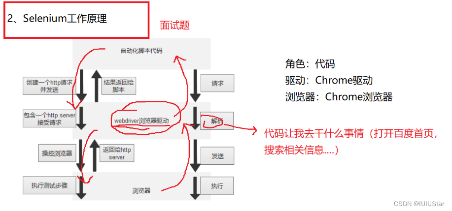 【首先通过自动化脚本代码运行,创建了一个HTTP请求,因此要有对应的服务器接收,所以webDriver浏览器驱动接收该请求,将该请求解析,获取信息:你是让我打开哪个网页?解析完成之后,通过驱动来让浏览器来执行解析好的命令,此时浏览器就可以执行代码让它做的事情了。因此浏览器并不是直接与代码进行交互,是通过驱动进行的。最后浏览器是否执行成功,将结果发送给驱动,然后驱动再发送给代码,因此可以观察到代码是否执行成功。】