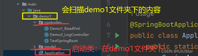 因为我们在之前的原生项目中,将bean交给Spring管理,需要在xml文件中配置扫描路径,而在Spring Boot中,约定会扫描启动类所在的路径以及子路径,比如下面这个例子: