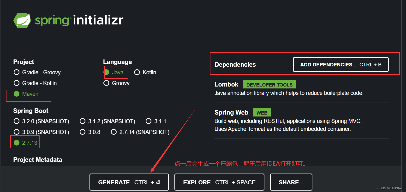 创建好之后,引入依赖!(个人感觉这是最难的一步,因为网络不好,你怎么引入都引入不进来,非常的崩溃)而且我还遇见一个问题,就是创建的pom文件中自动生成的是2.7.13.RELEASE这个版本,怎么切换网络都不行,最后发现IDEA生成的这个版本官网上就不存在!因此将版本改为2.7.13即可!最后包也引入成功了,但是pom文件中有一处还是标红,但是不影响使用,如果有知道这个问题的小伙伴可以告诉我下~