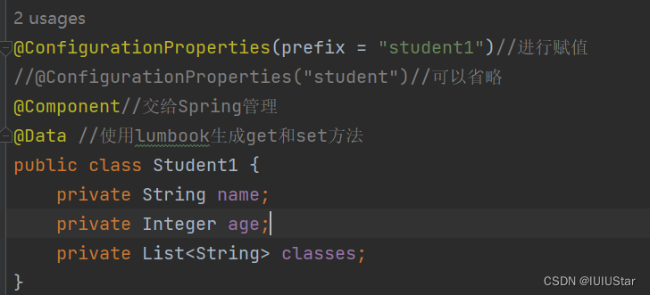 补充:我们之前创建一个类的时候,属性如果为私有的,要设置它的get和set方法。我们之前在创建项目的时候引入了lombok,所以可以使用它来更加简洁的获取get和set方法。(在类上加@Data注解)