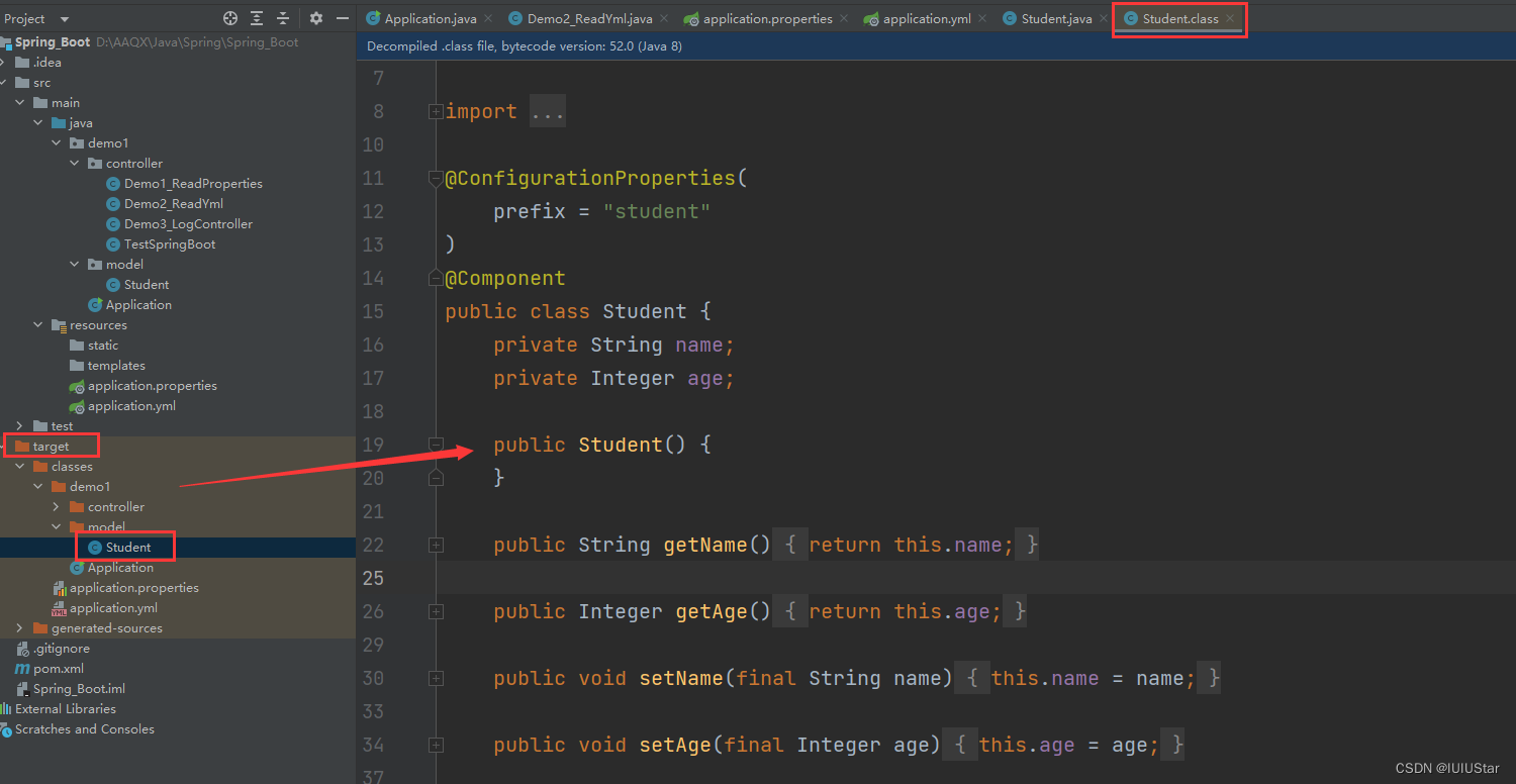 经过编译之后,我们在target下找到Student类,可以发现,是我们正常方式写的这种get与set方法的形式,说明我们这种引入lombok的形式是成功的。