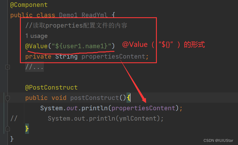 (2)读取配置⽂件中的内容,@Value 注解使⽤“${}”的格式读取;