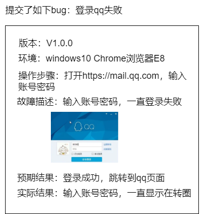(4)预期行为的描述:要让开发人员知道怎么样才是正确的,尤其要以用户的角度来描述程序的行为是怎样的。如果是依据需求提出的故障,能写明需求的来源是最好的。(5)错误行为的描述:描述错误的现象。可以上传log,截图等。
