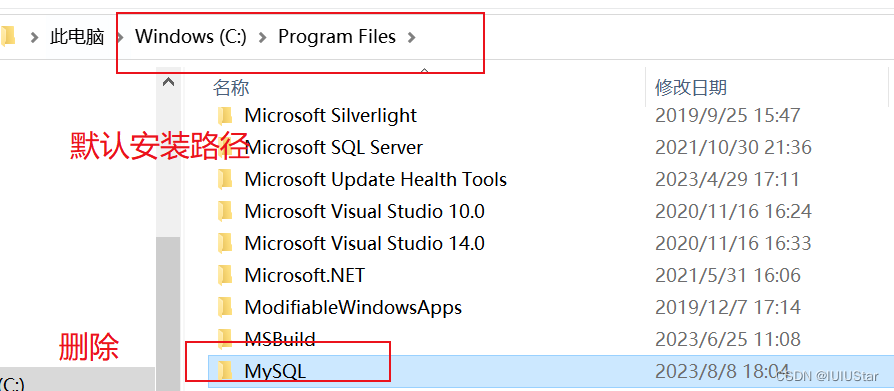 (3)在C盘下找到ProgramFiles文件(MySQL文件默认安装在这里,否则就去自己的安装路径下面找,找到MySQL文件并删除。)
