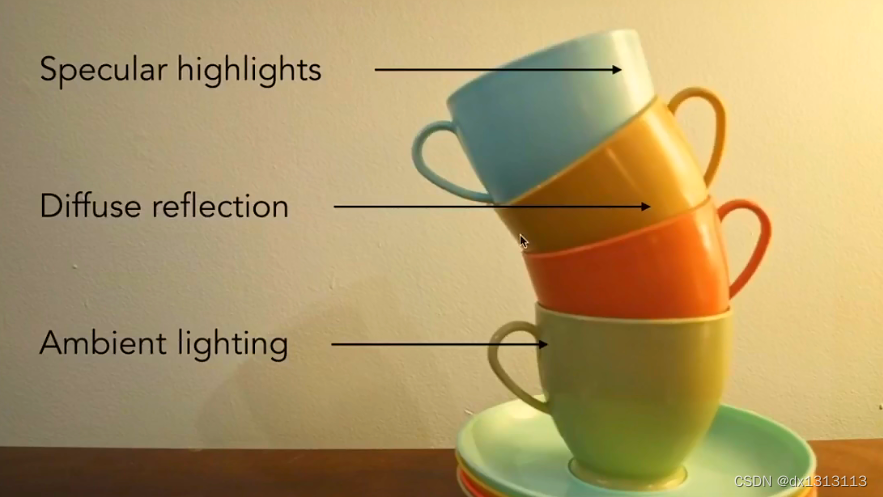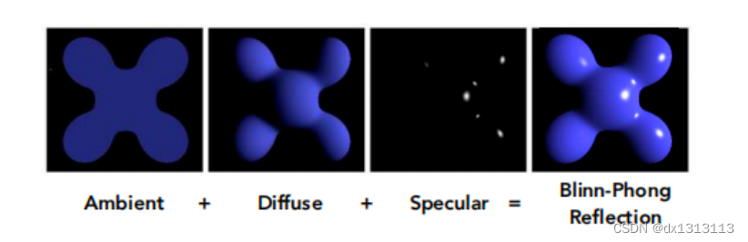 它将进入摄像机的光线分为三个部分,每个部分使用一种方法来计算它的贡献度,这三个部分分别是环境光(Ambient)、漫反射(Diffuse)和高光反射(Specular)。
