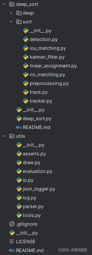 kalman_filter.py:卡尔曼滤波器的相关代码,主要是利用卡尔曼滤波来预测检测框的轨迹信息。