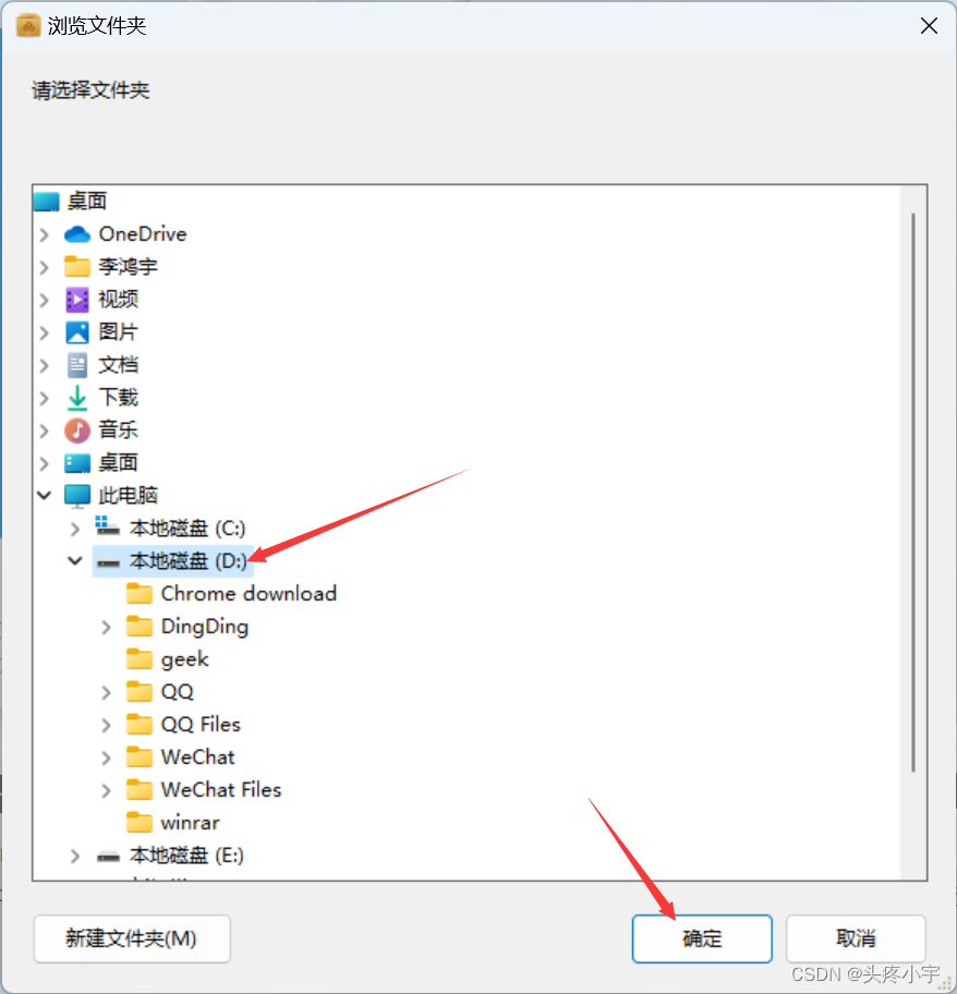 - 选择 D 盘(除了 C 盘就行),再点 确定