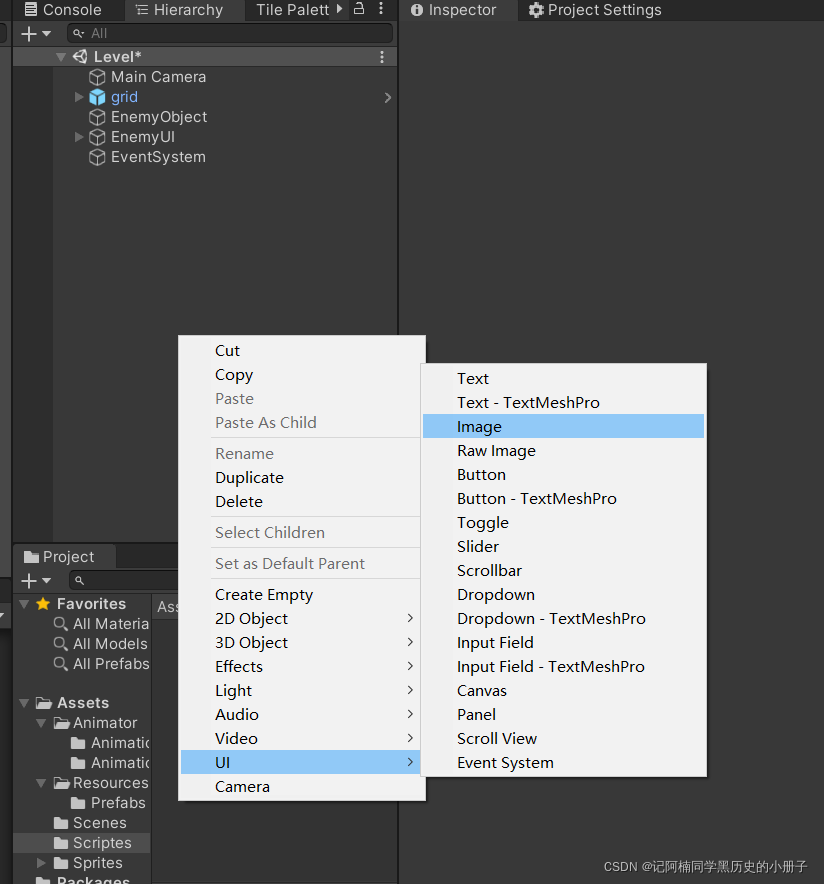(1)通过Unity的内置模块,我们可以轻松的在Hierarchy结构界面构建UI元素,鼠标反手键,选择UI栏,里面的Image。
