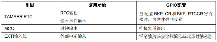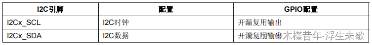 注意事项:当GPIO引脚的主功能为驱动片上外设(如I2C)时,此时也可选择对应推挽/开漏输出模式而不启用复用引脚功能。此外如果有多个复用功能模块对应同一个引脚,只能使能其中之一,其它模块保持非使能状态。