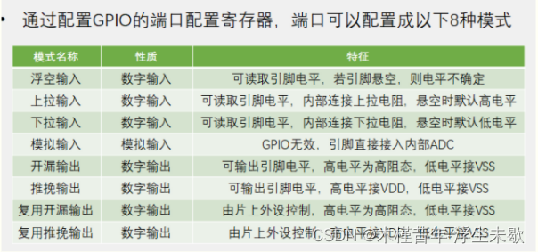 通过 GPIO 内部的结构关系,GPIO的引脚分为了输入和输出,以及还有一个复用的功能,决定了 GPIO 可以配置成以下几种模式。