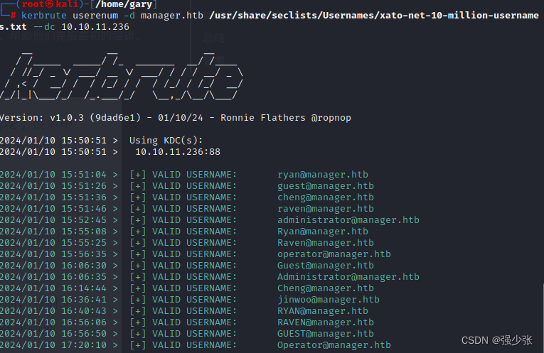 HTB Manager ESC7 域提权 使用kerbrute爆破administrator用户,未爆破出来,因为administrator用户通常是未设置密码错误阀数,不推荐直接爆破,会有安全日志。使用responder开启伪造服务器,当mssql访问时就会把凭证发过来,再通过破解hash登录mssql获得最高权限。将用户名放入user.txt,使用crackmapexec进行爆破密码同用户名一样的。访问权限来进行域权限升级,但可以使用它来颁发或拒绝待处理的证书请求。这里爆破的时间很长,下面是爆破出来的用户名。