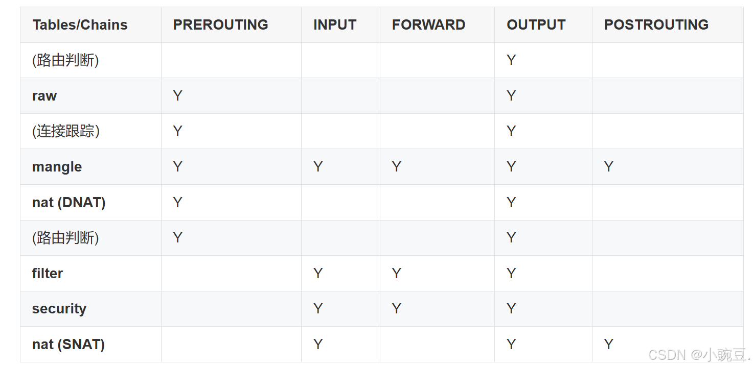 iptables 使用 table 来组织规则,根据用来做什么类型的判断,将规则分为不同table。在每个 table 内部,规则被进一步组织成 chain,内置的 chain 是由内置的 hook 触发 的。chain 基本上能决定规则何时被匹配。内置的 chain 名字和 netfilter hook 名字是一一对应的:如PREROUTING是 由 NF_IP_PRE_ROUTING hook 触发的chain