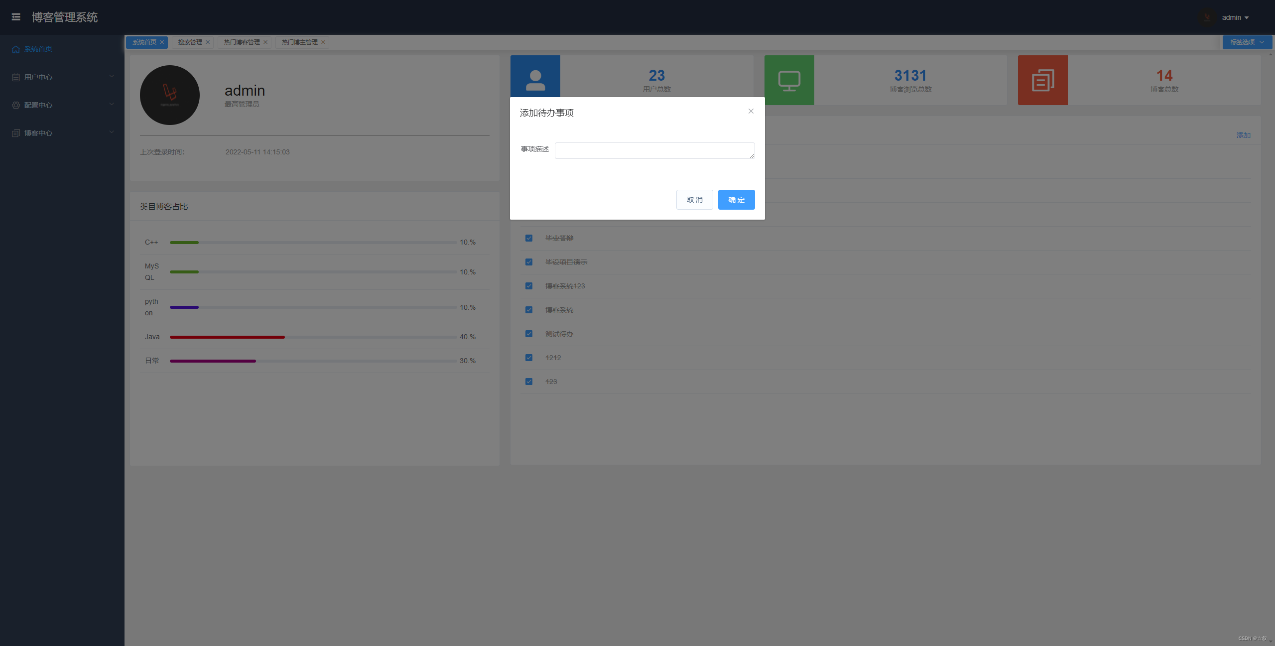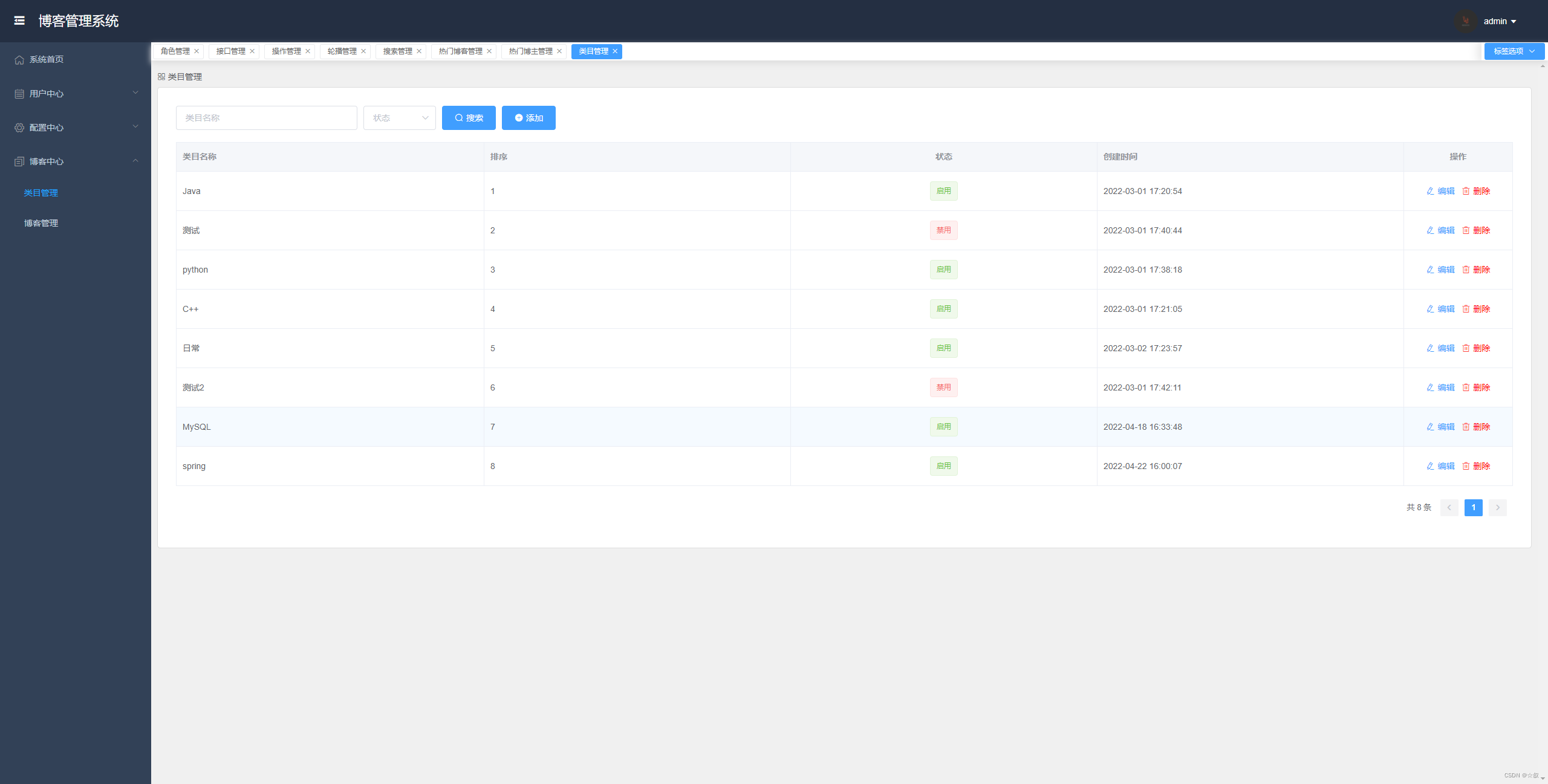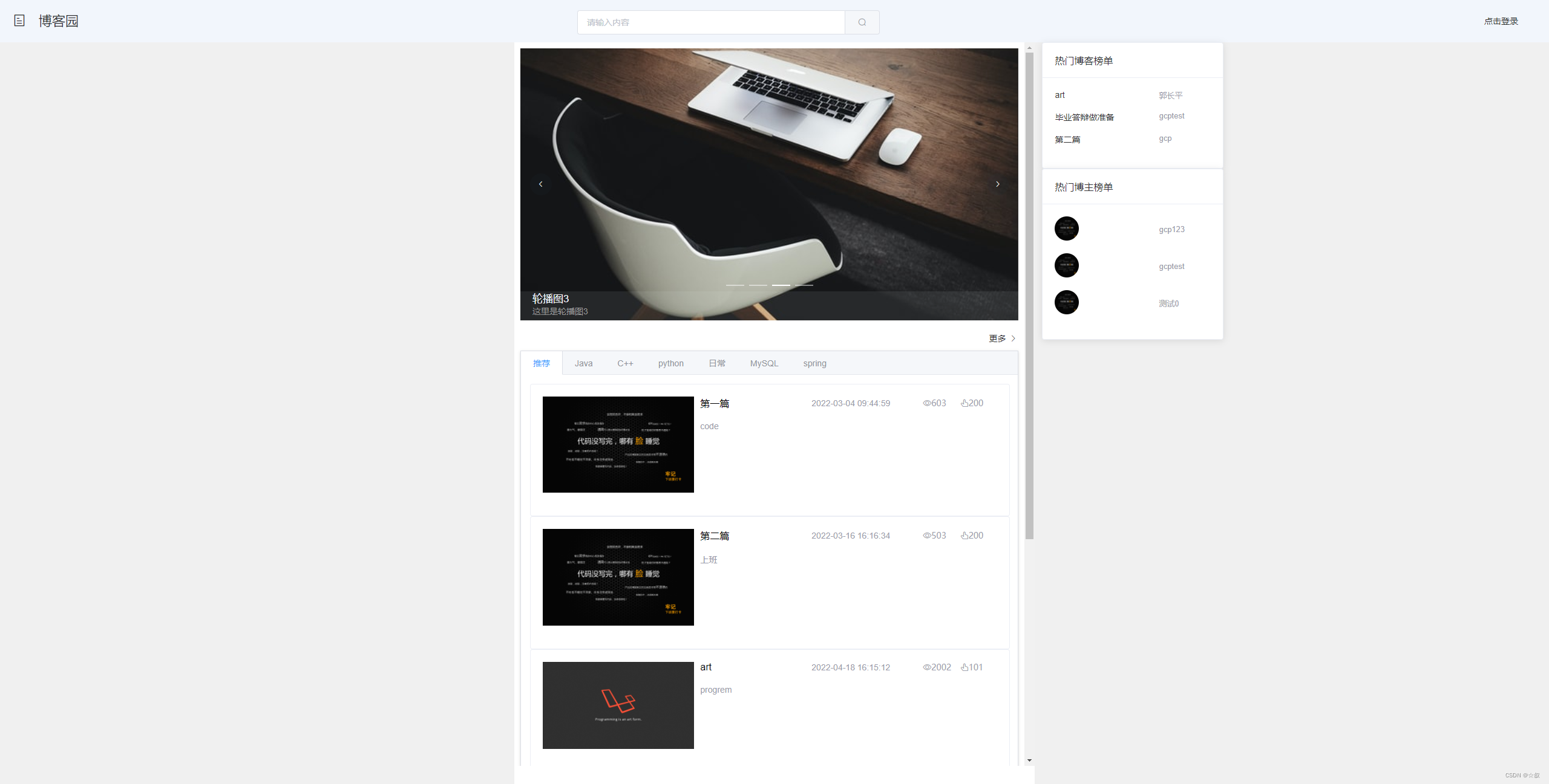 本系统采用SSM的框架,前后端分离,后端使用Java开发,使用到的框架是springboot,数据使用MySql和Redis进行存储,与数据库进行交互,使用的是持久层框架MyBatis-plus,前端使用VUE3构建和开发。该系统前端界面分为前台和后台,前台是给普通用户使用的,后台只有管理员才能使用的,前台具有的功能是:登录注册、搜索博客、浏览博客、博客评论、编辑个人信息、编辑并发布博客等等;后台主要是对前台进行管理,后台具有的功能是:管理用户信息、管理角色、管理角色权限、管理账号、管理博客类目、管理博客、前台首页轮播图设置、前台首页各榜单内容设置等等。