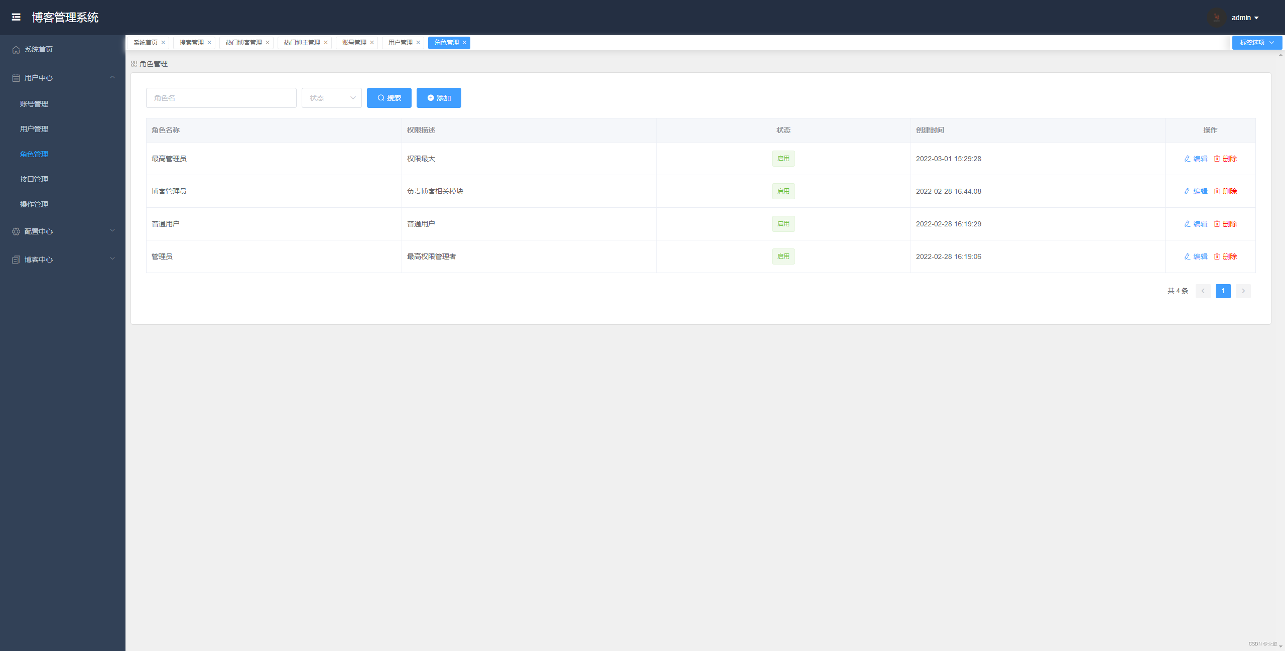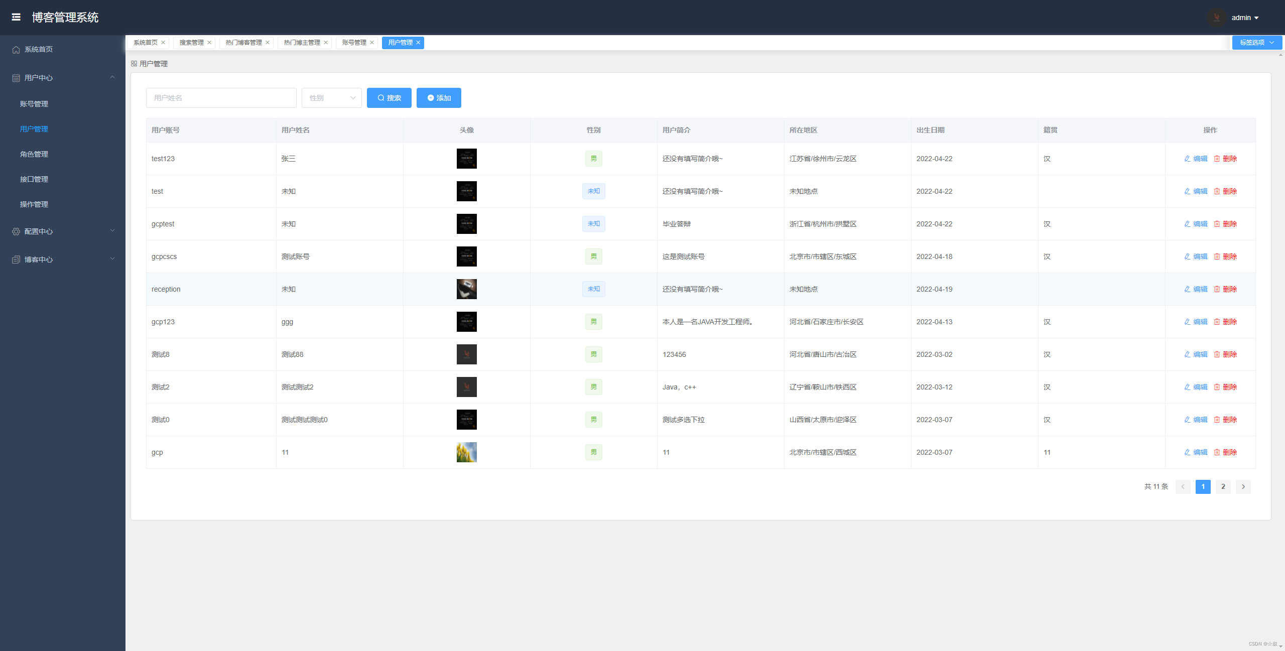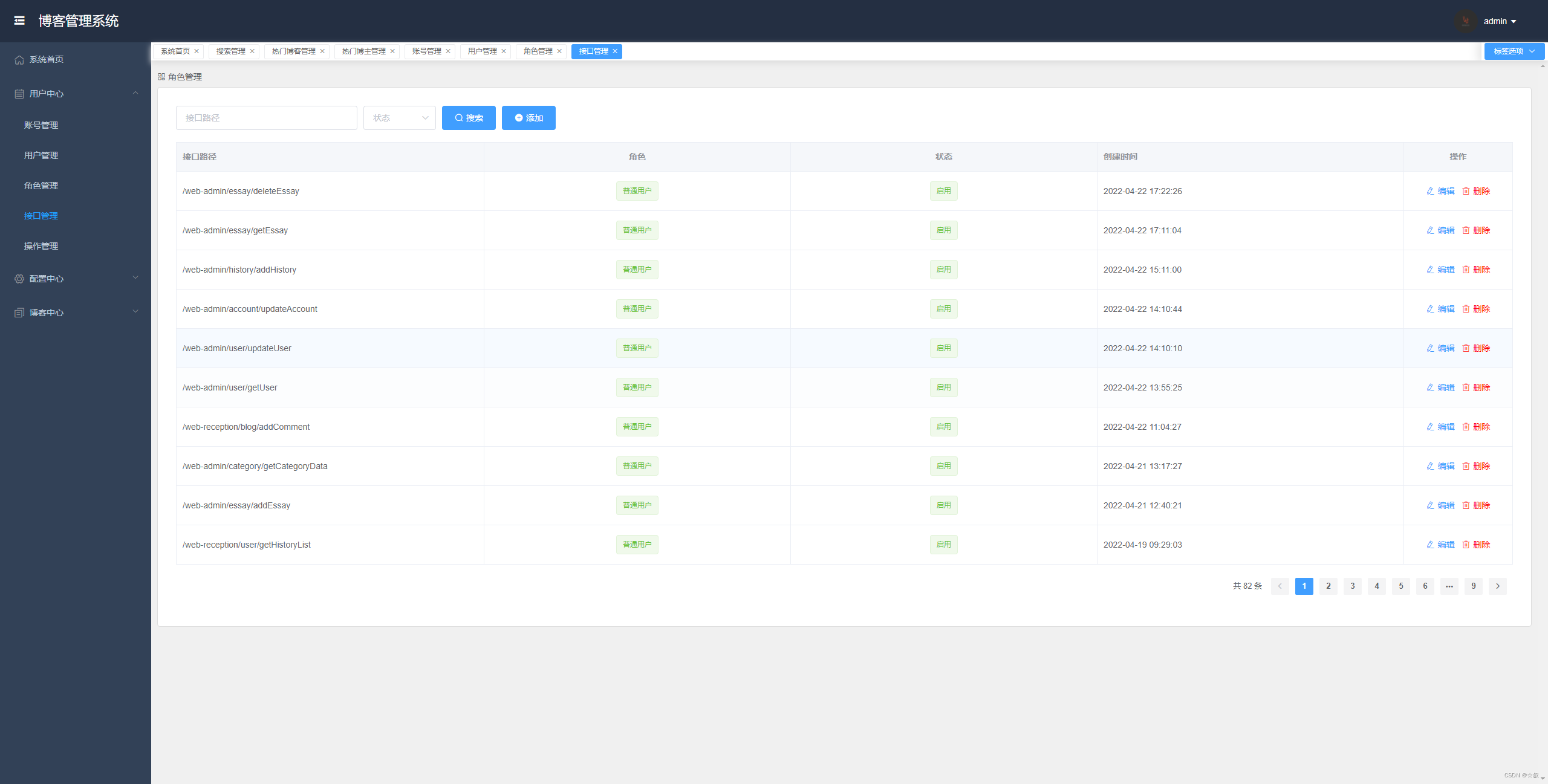 本系统采用SSM的框架,前后端分离,后端使用Java开发,使用到的框架是springboot,数据使用MySql和Redis进行存储,与数据库进行交互,使用的是持久层框架MyBatis-plus,前端使用VUE3构建和开发。该系统前端界面分为前台和后台,前台是给普通用户使用的,后台只有管理员才能使用的,前台具有的功能是:登录注册、搜索博客、浏览博客、博客评论、编辑个人信息、编辑并发布博客等等;后台主要是对前台进行管理,后台具有的功能是:管理用户信息、管理角色、管理角色权限、管理账号、管理博客类目、管理博客、前台首页轮播图设置、前台首页各榜单内容设置等等。