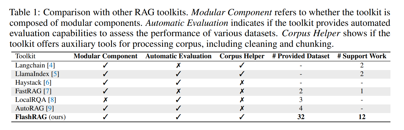 - FlashRAG: A Modular Toolkit for Efficient Retrieval-Augmented Generation Research (https://arxiv.org/abs/2405.13576)