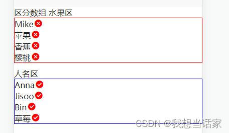 两数组内容相斥,改变其中一个数组影响另一个数组 需求:常用于将一整个范围内的数据区分为两个互斥数组,下文的例子可以作为一个小游戏,在所有给出的名词中区分出人名和水果名。改变其中一个数组内容会直接影响另一个数组。将实际存储水果名和人名的数组在computed里面定义和处理,通过关联两个数组实现一个数组改变另一个数组直接改变。实现思路:(用uniapp框架示范,vue框架也适用)定义两个数组存分别存放所有数据,和初始被选中数据。
