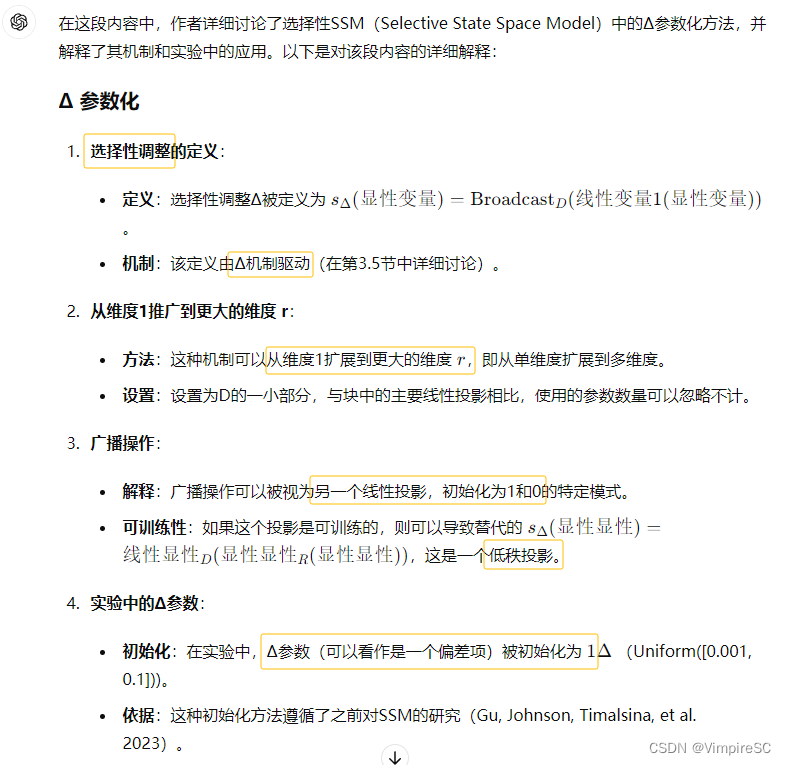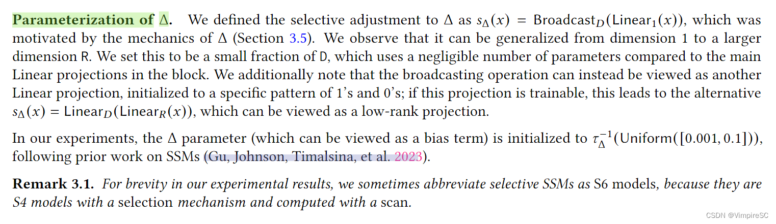详细讨论了选择性SSM(Selective State Space Model)中的Δ参数化方法,并解释了其机制和实验中的应用。
