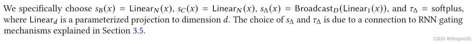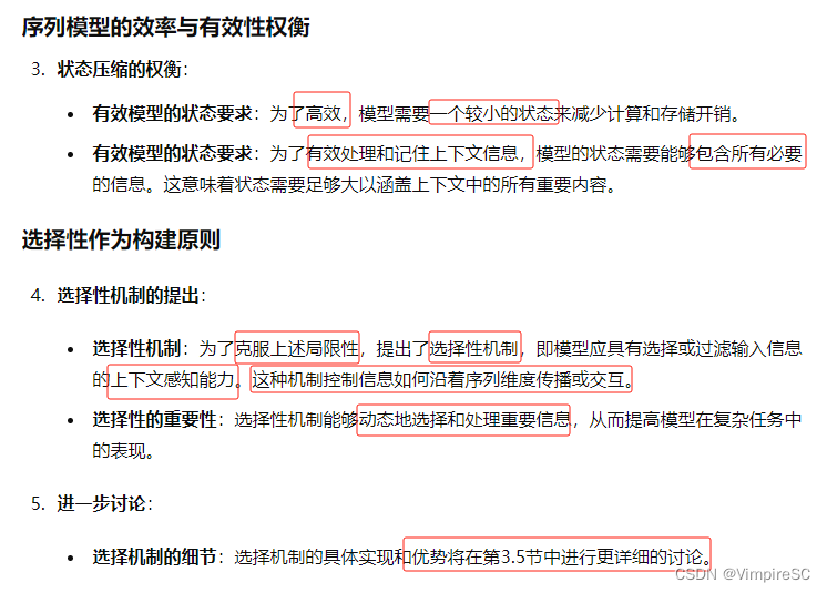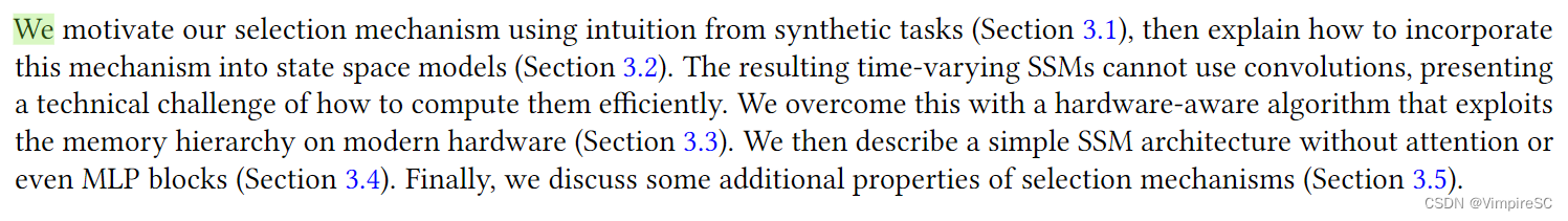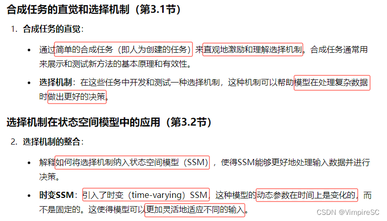 3.2节:解释如何将选择机制纳入状态空间模型以及引入了时变SSM(动态参数在时间上是变化的)