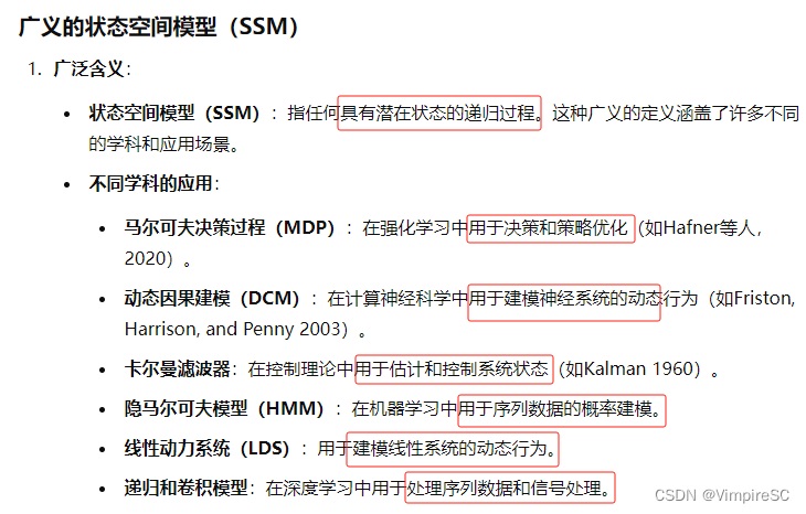 解释了状态空间模型(SSM)及其在现代神经网络架构中的应用。