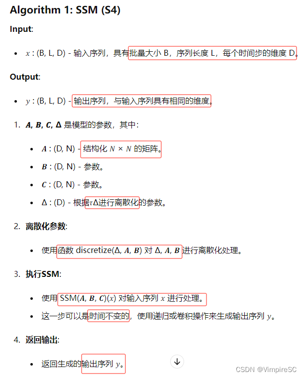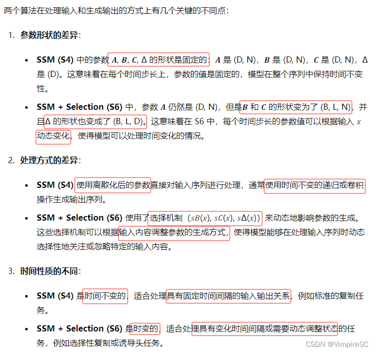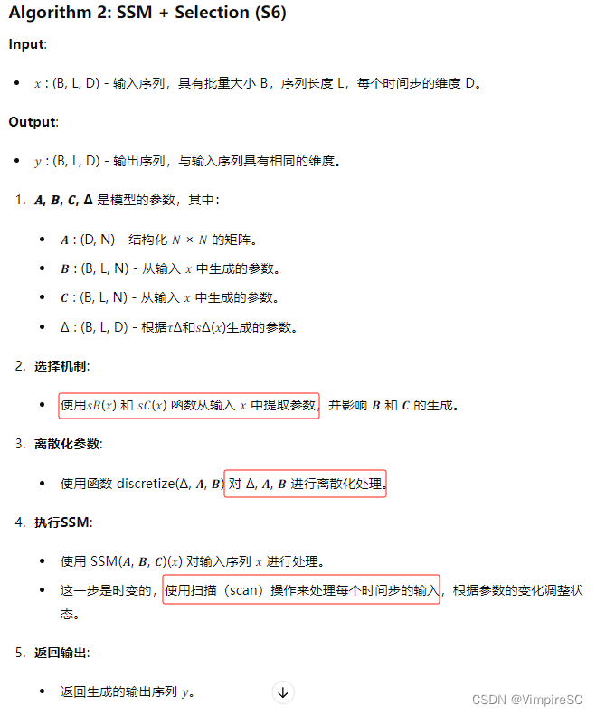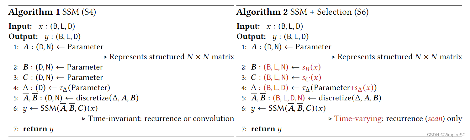 这里给出了两个算法,分别是 SSM (S4) 和 SSM + Selection (S6)。它们描述了结构化状态空间模型(SSM)在处理输入序列 𝑥 后生成输出序列 𝑦 的过程