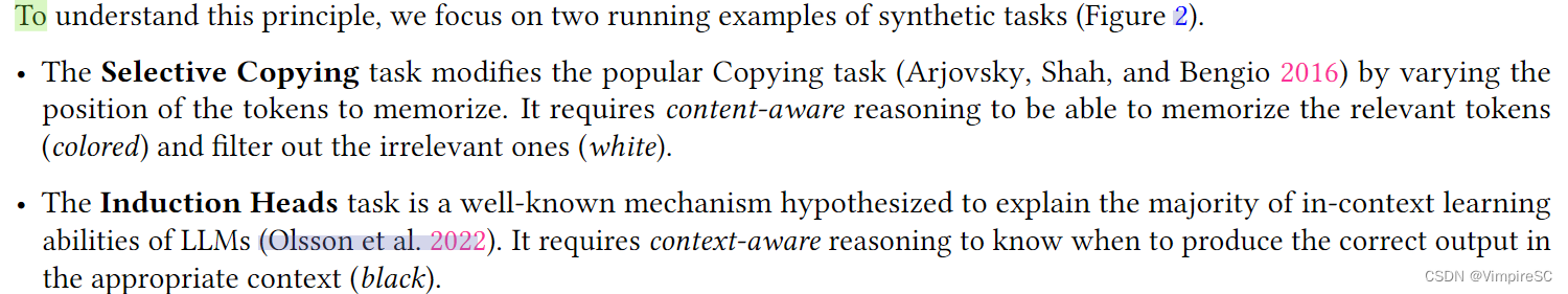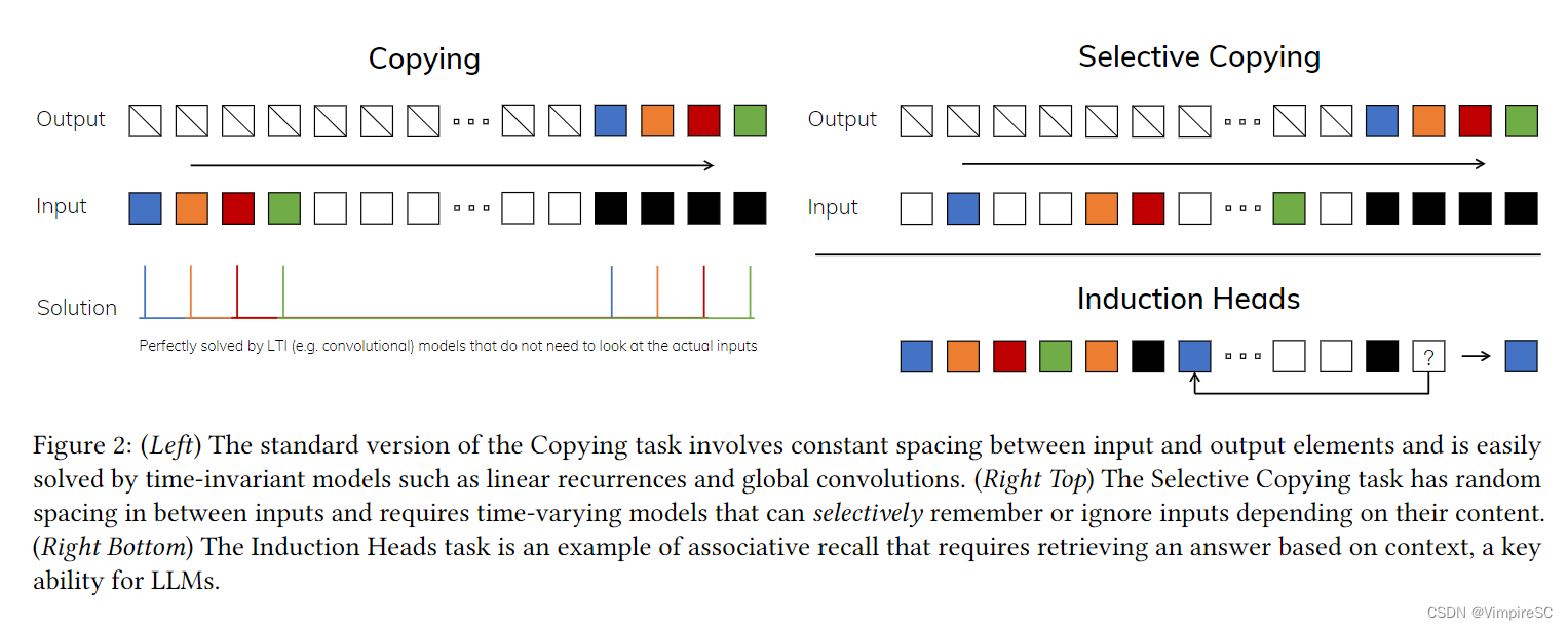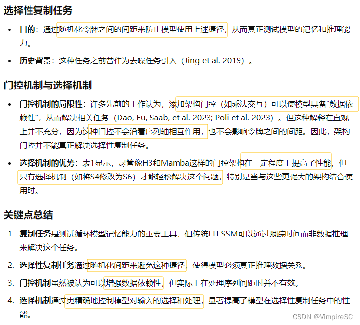 解释了选择性复制任务在序列建模中的重要性及其设计意图,同时比较了不同模型在该任务中的性能表现。
