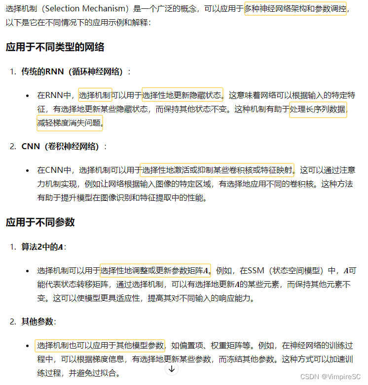 选择机制(Selection Mechanism)是一个广泛的概念,可以应用于多种神经网络架构和参数调控,以下是它在不同情况下的应用示例和解释: