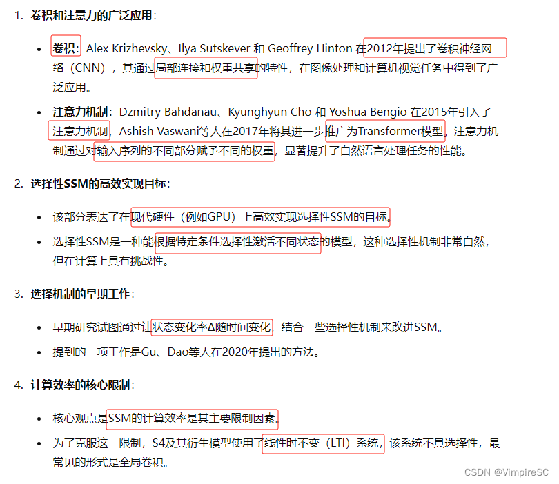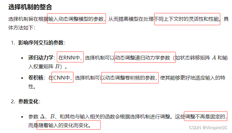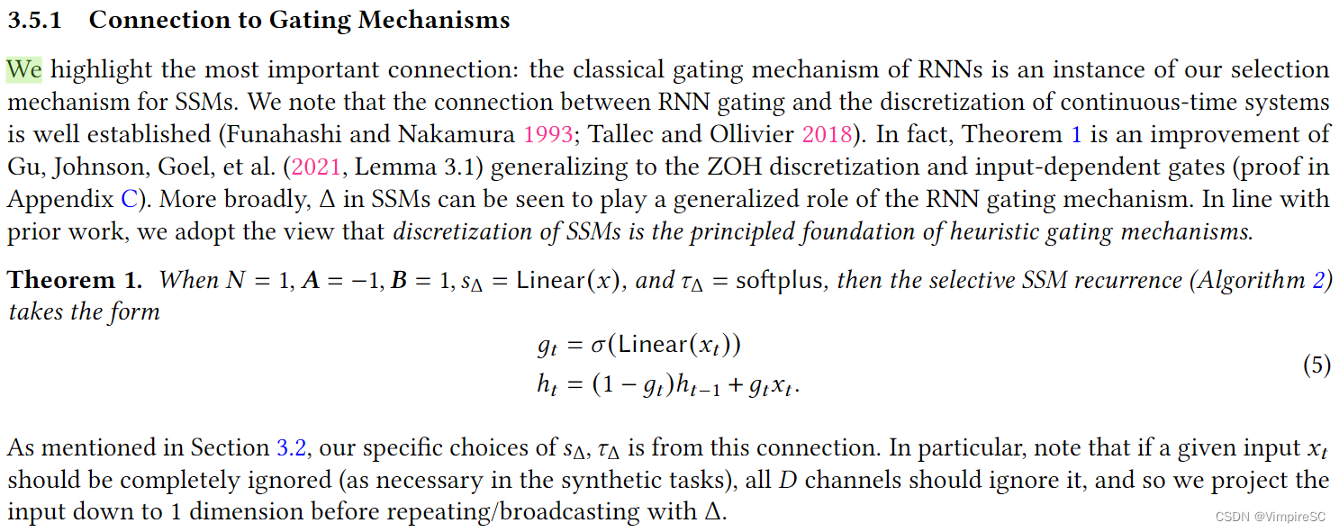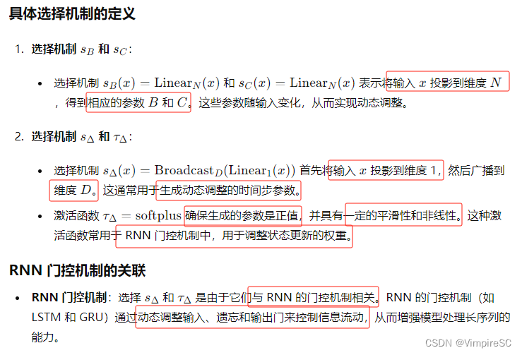 探讨了选择机制(Selection Mechanism)在SSM(State Space Models)中的应用,并将其与RNN(Recurrent Neural Network)经典门控机制进行了对比