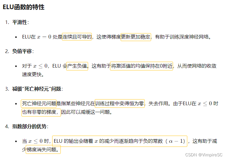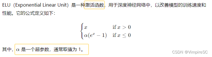 ELU 是一种在深度神经网络中常用的激活函数,它通过在负值区域的平滑指数函数形式,减缓了梯度消失和死亡神经元问题,从而加快了模型的收敛速度。与 ReLU、Leaky ReLU 等激活函数相比,ELU 提供了更稳定的训练过程和潜在的性能提升。